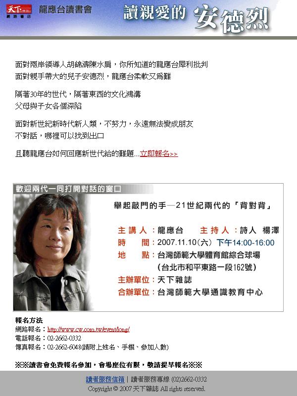 以下是11/10(六)龍應台作家最"為難"的一本書---"親愛的安德烈"新書論壇資訊