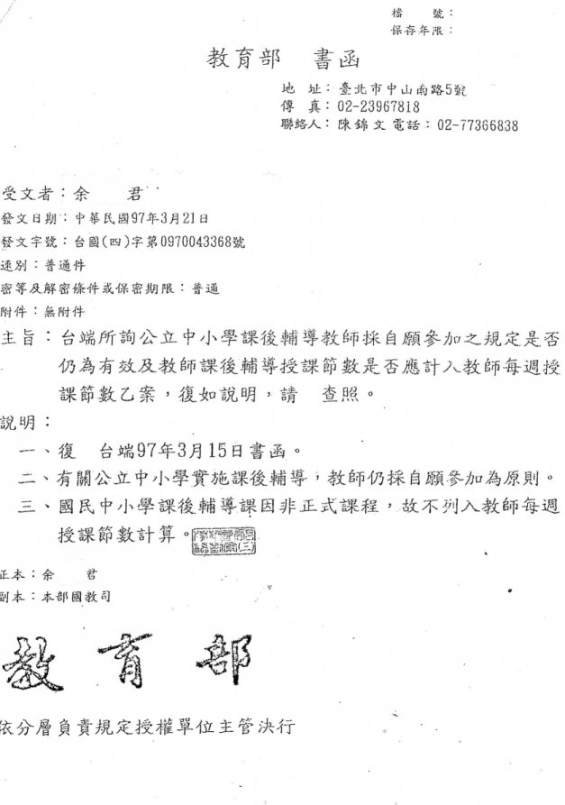 教育部函:公立中小學實施課後輔導,教師採自願參加為原則。