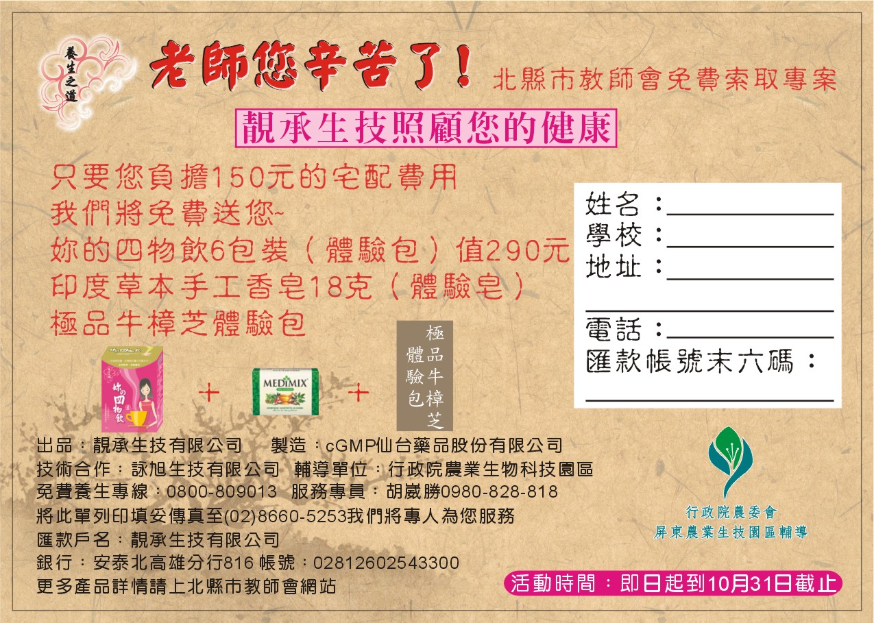 [優惠福利]靓承生技---北縣教師會免費索取專案