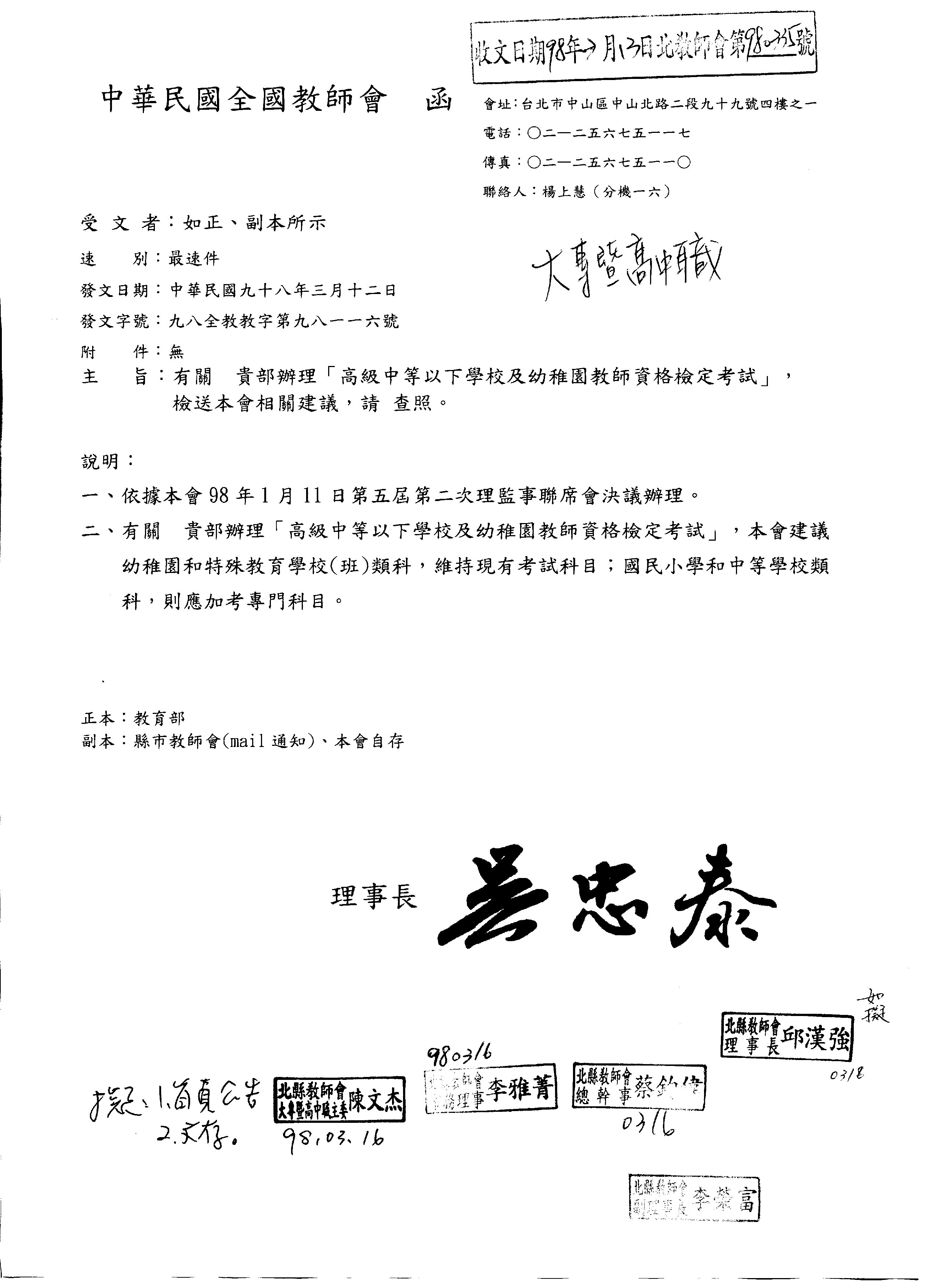 [重要公文]高級中等以下學校及幼稚園教師資格檢定考試相關公文