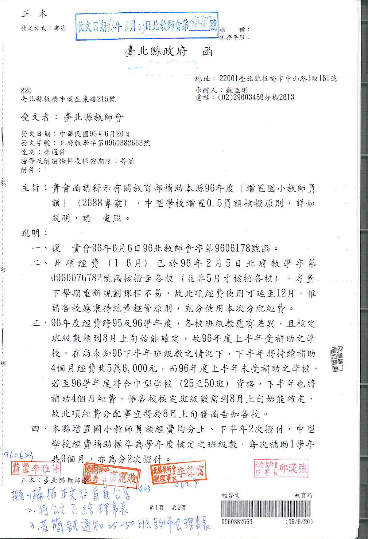 縣府回文-96年度增置國小教師員額,中型學校增置0.5員額核撥原則1.jpg