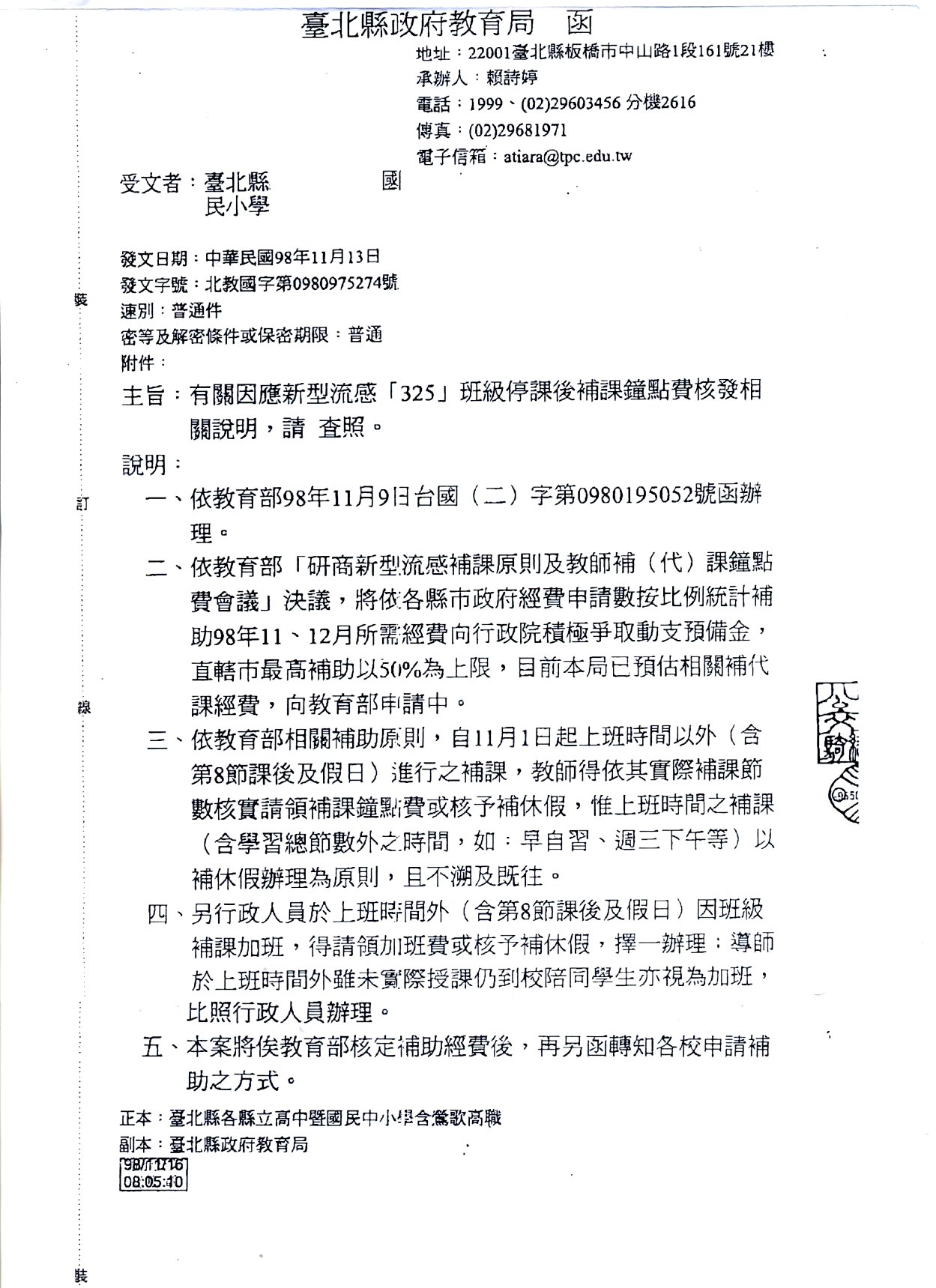 [政策法規部]教育局函:停課後補課鐘點費及加班費自11/1起算核發。詳閱附件。