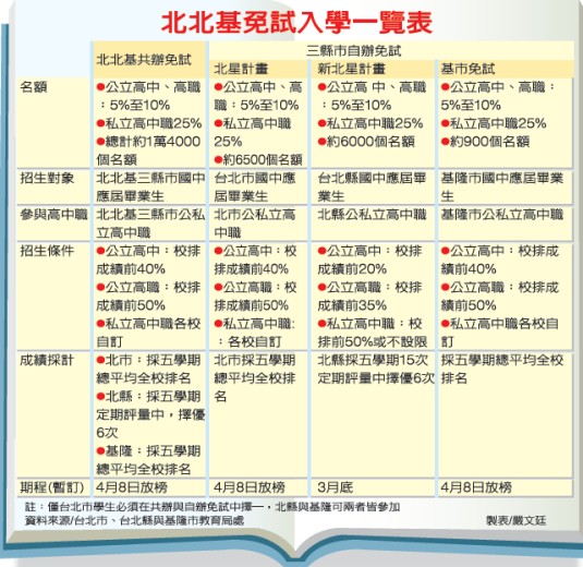 北北基三縣市配合教育部政策,推動免試入學,但三縣市又不願意好學生被搶走,以致出現「共辦免試又各自自辦」的怪現象,讓明年的北北基免試入學方案出現四種入學措施。四種免試放榜時間更是斟酌,尤其北縣將放榜日期提前至3月底,將好學生留在台北縣的企圖心很明顯。
