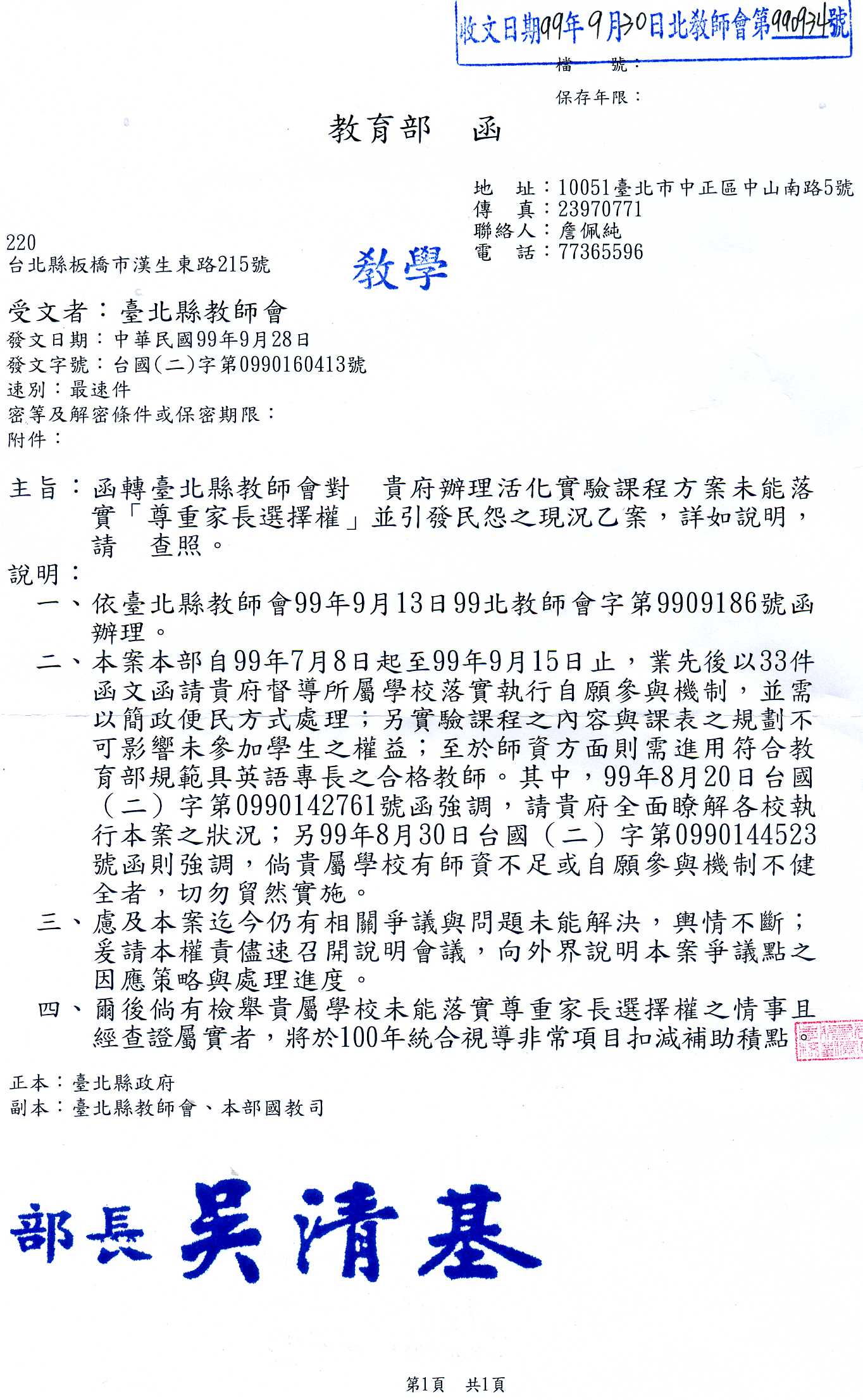 [教學部]教育部函臺北縣政府有關活化課程家長選擇權案