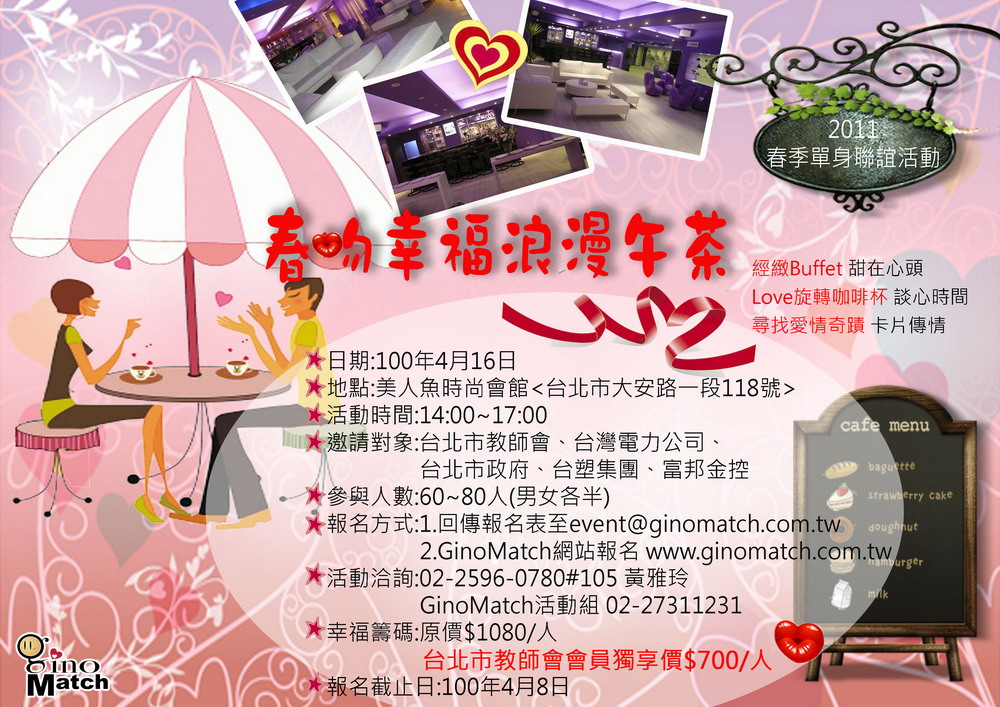本會於4/16辦理春吻浪漫午茶 未婚聯誼活動 目前女生尚有名額,男生已接近額滿