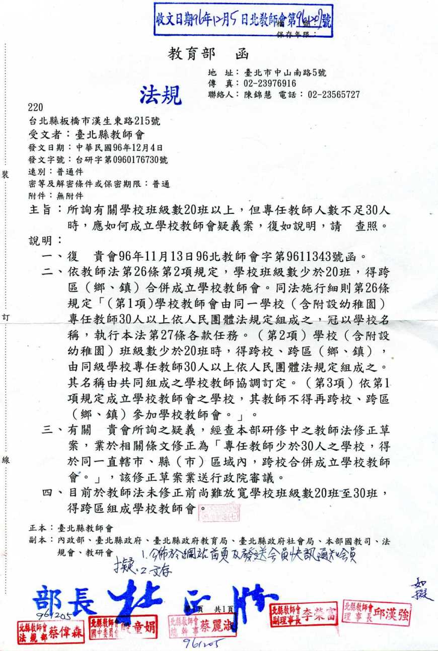 教育部回函:本會所詢有關學校班級數20班以上,但專任教師人數不足30人時,應如何成立學校教師會疑義案。