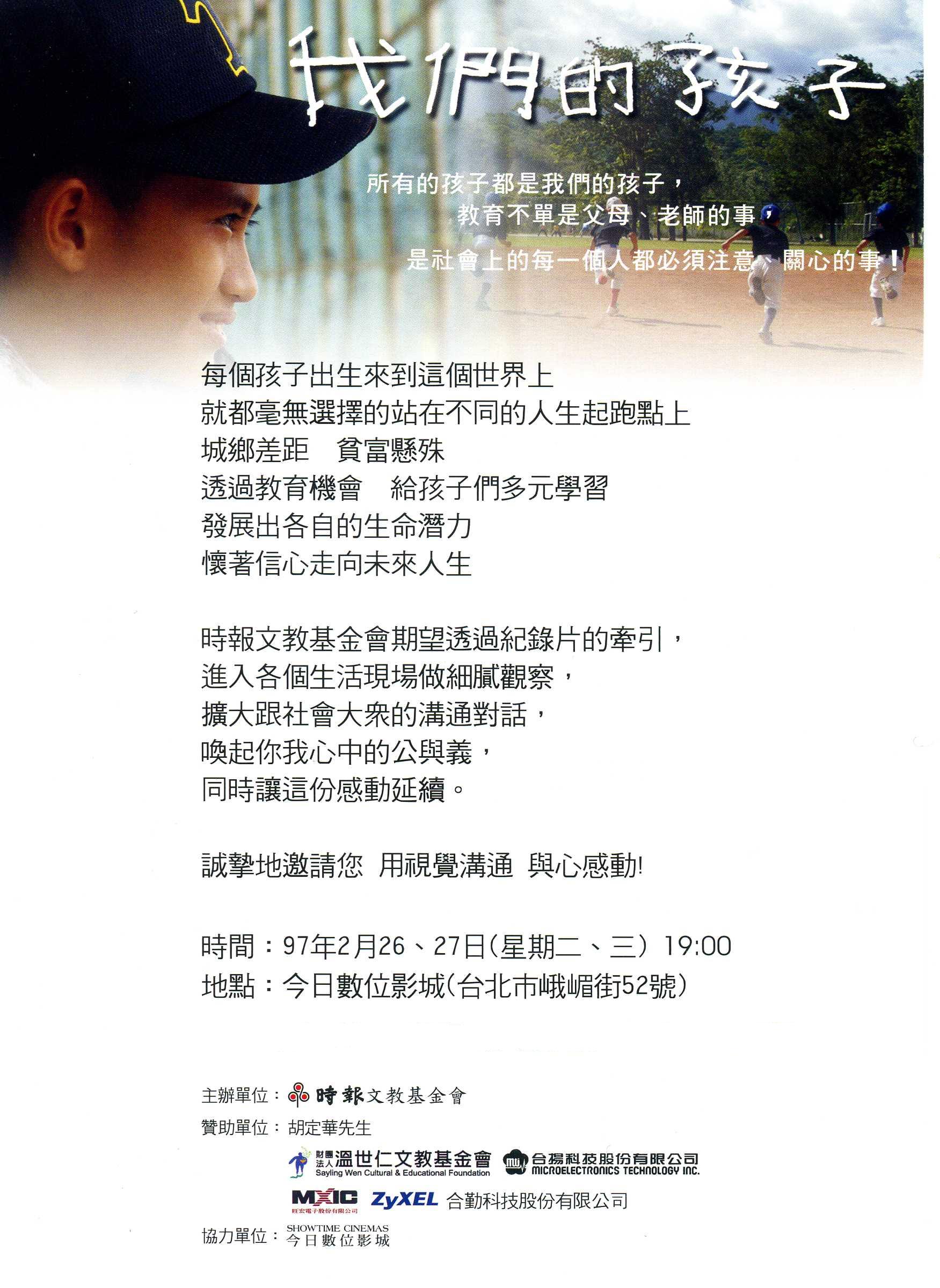 2月26日、2月27日晚上7點起,時報文教基金會免費邀請各30名會員欣賞「我們的孩子」