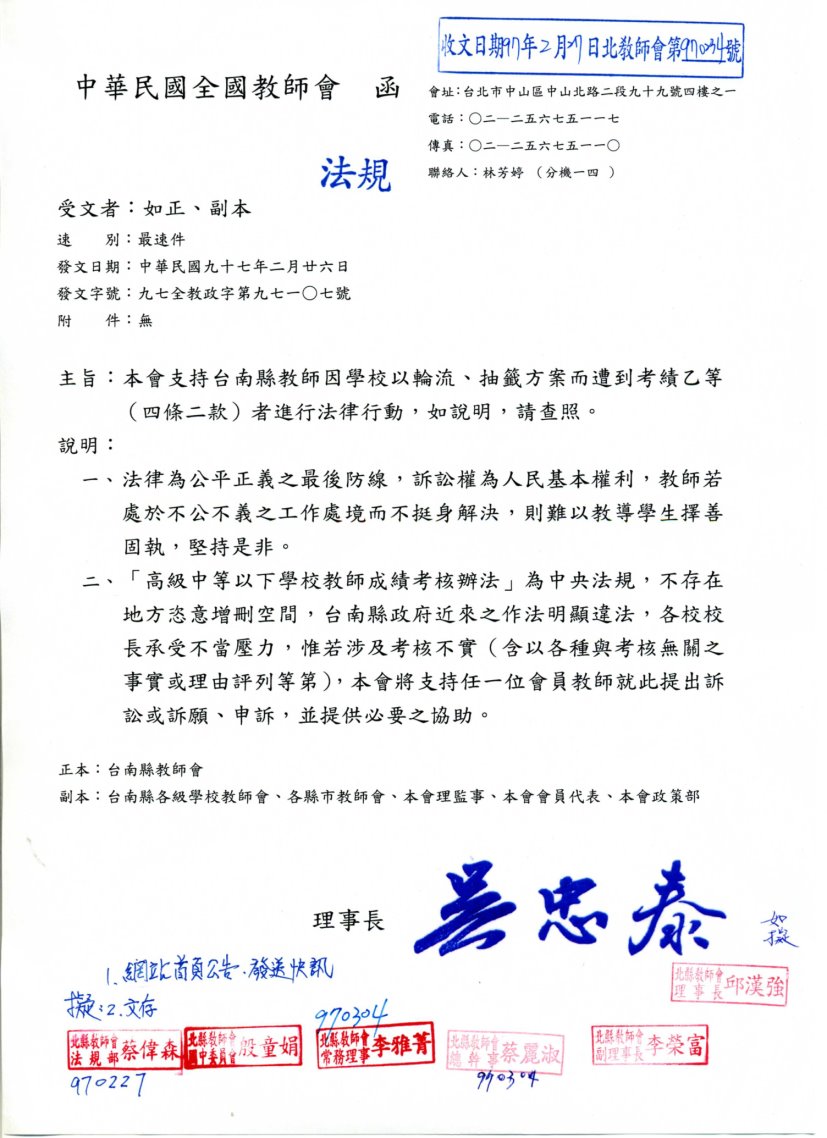 全教會函:支持台南縣教師因學校以輪流、抽籤方案而遭到考績乙等(四條二款)者進行法律行動。