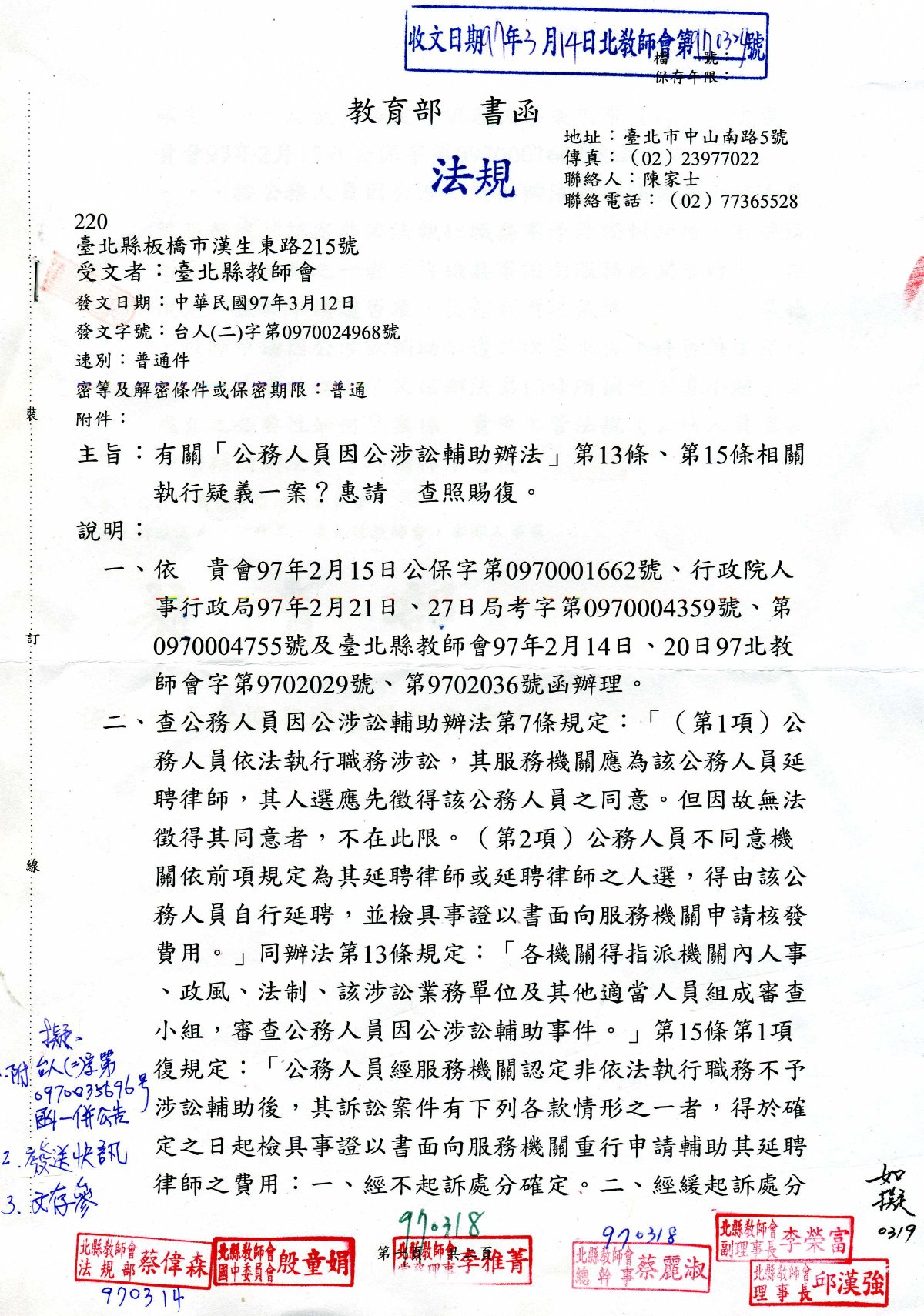 教育部回函:有關「公務人員因公涉訟輔助辦法」第13條、第15條相關執行疑義一案。