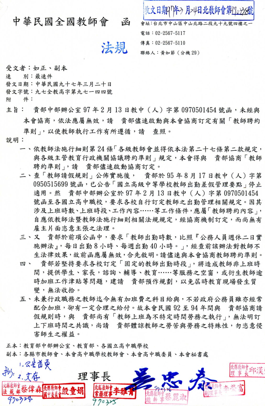 全教會函:建請教育部儘速與全教會協商訂定「教師聘約準則」一案。