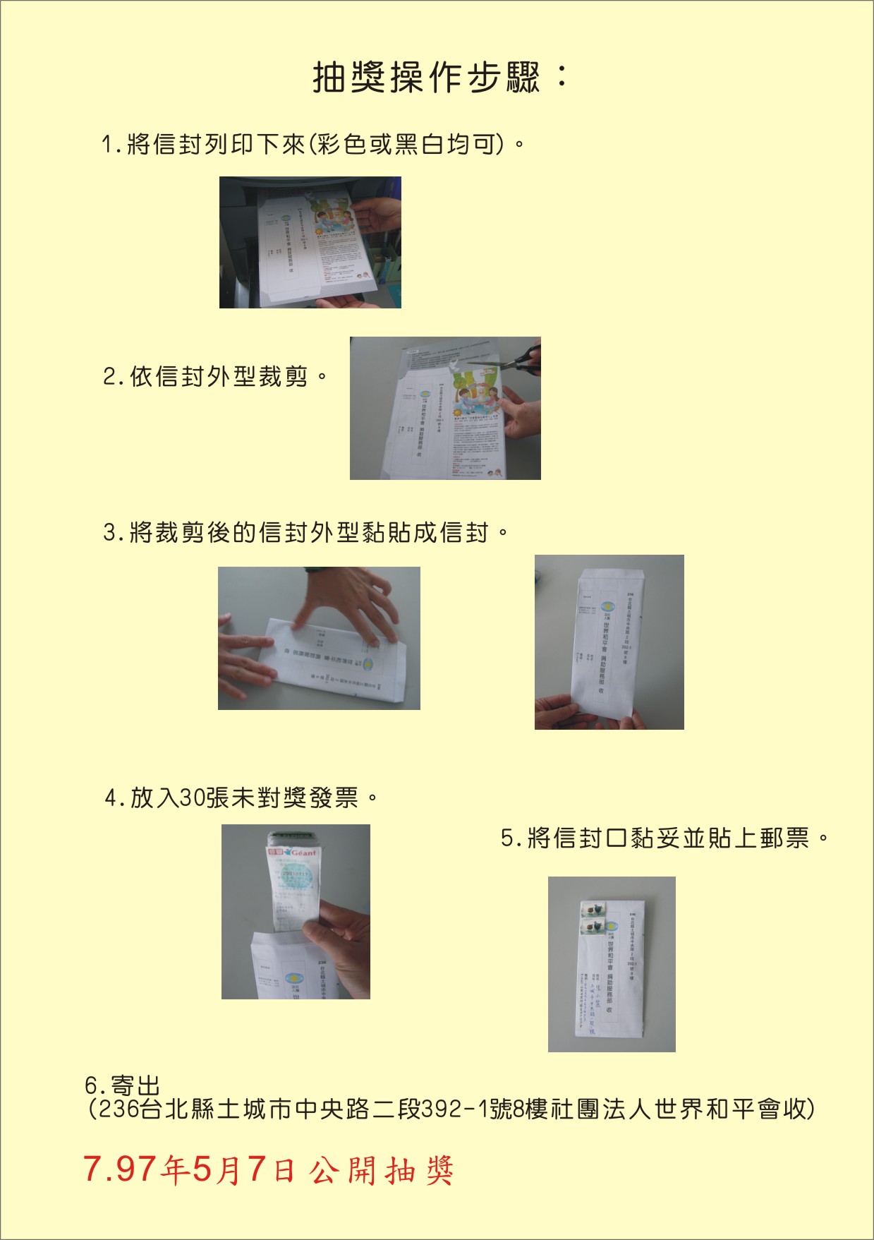 6.寄出(236台北縣土城市中央路二段392-1號8樓 社團法人世界和平會收)