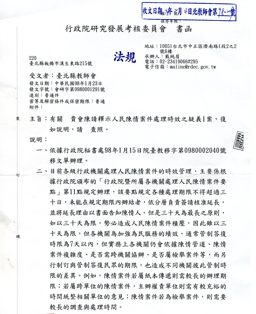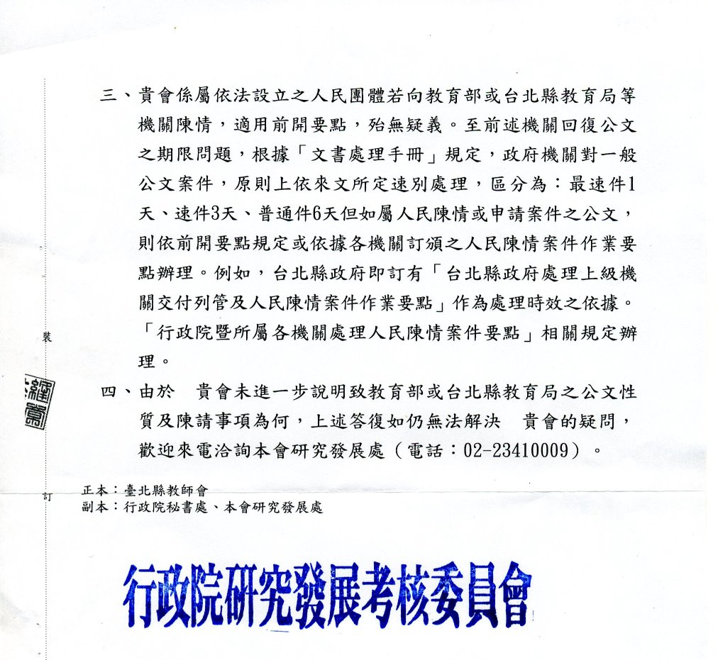 行政院研考會回函:答覆本會向教育主管機關陳情案件處理時效疑義一案