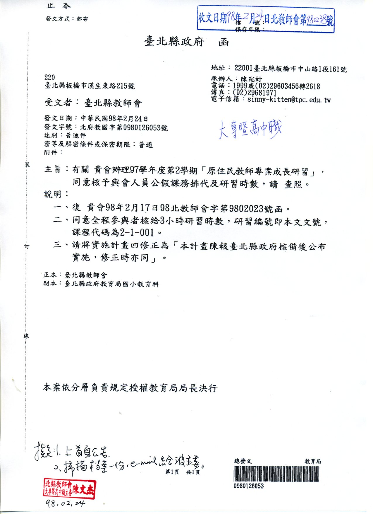 眨眼 [重要公文]臺北縣教師會辦理原住民教師專業成長研習實施計畫暨公假派代公文