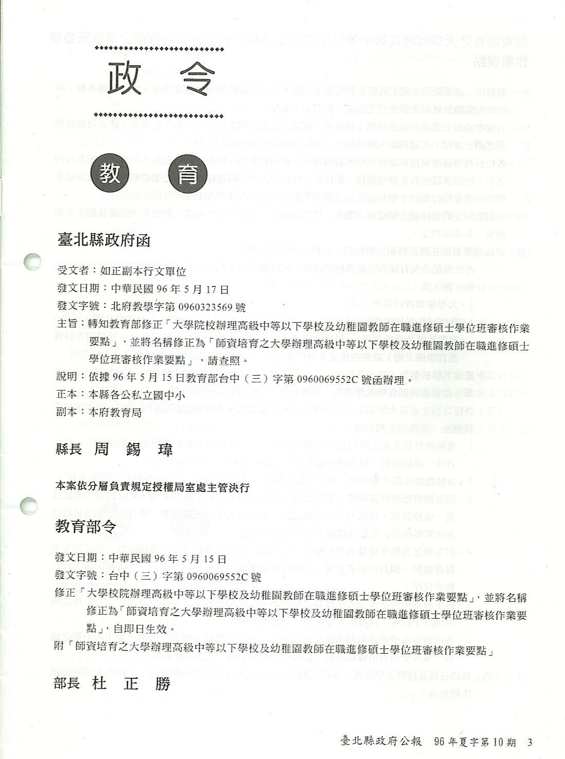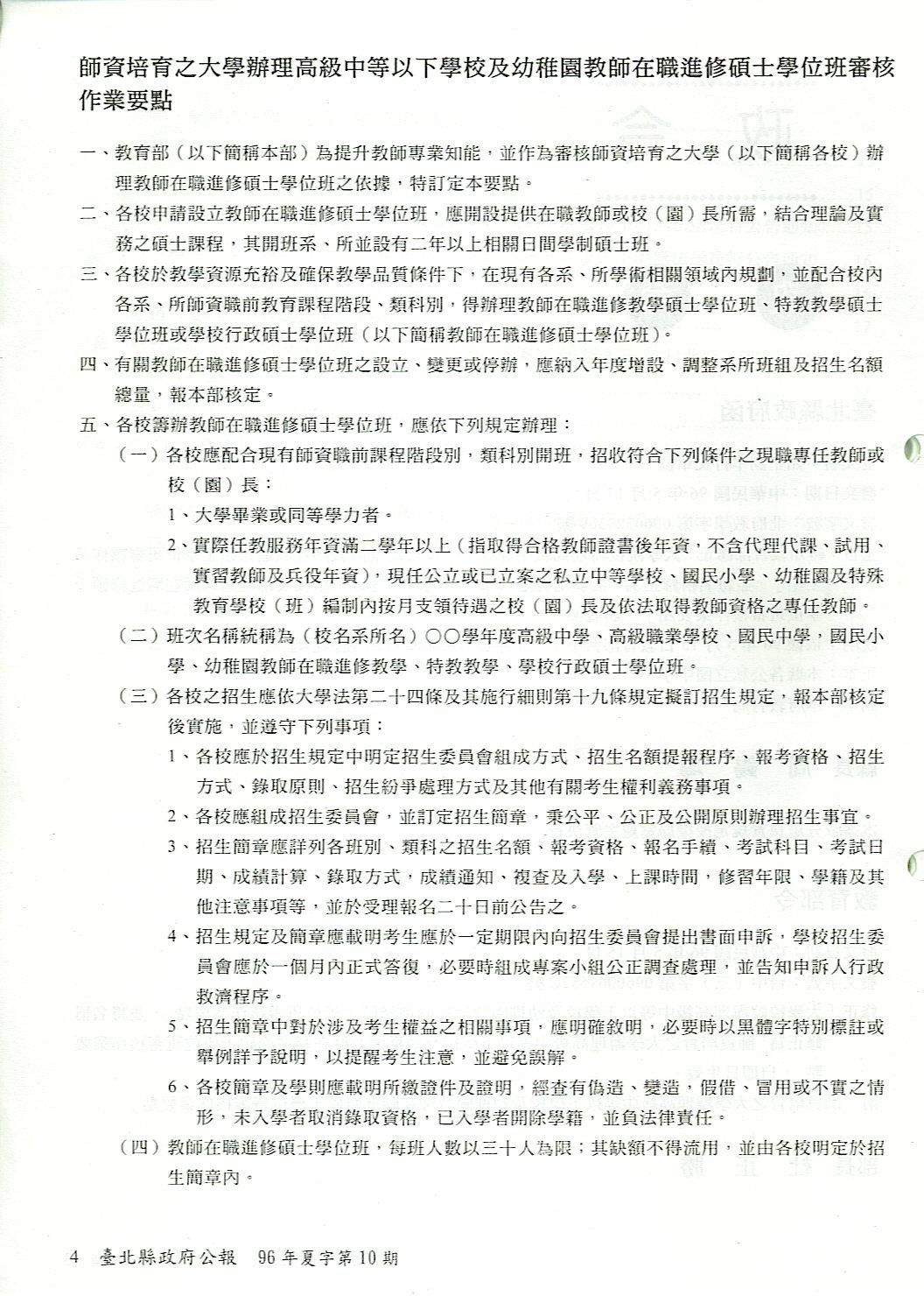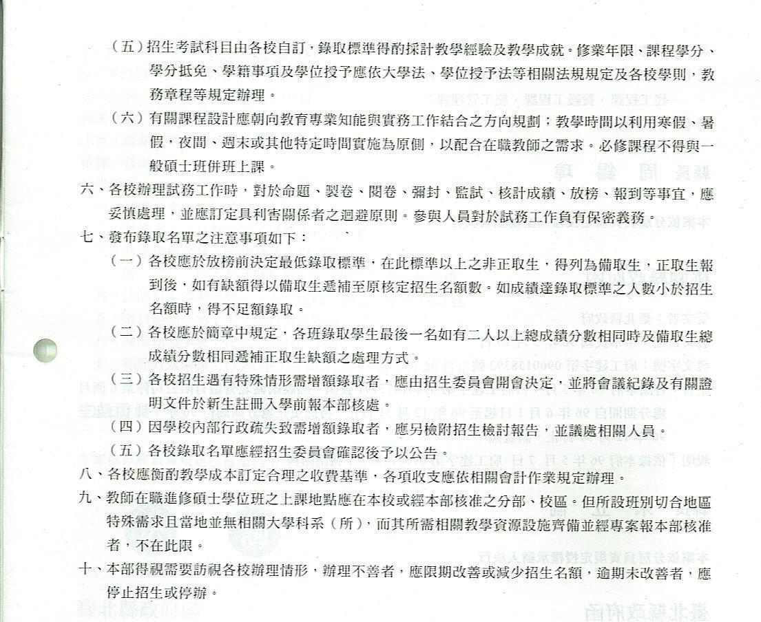 [重要公文]教育部修正「大學院校辦理高級中等以下學校 幼稚園教師在職進修碩士學位班審核作業要點
