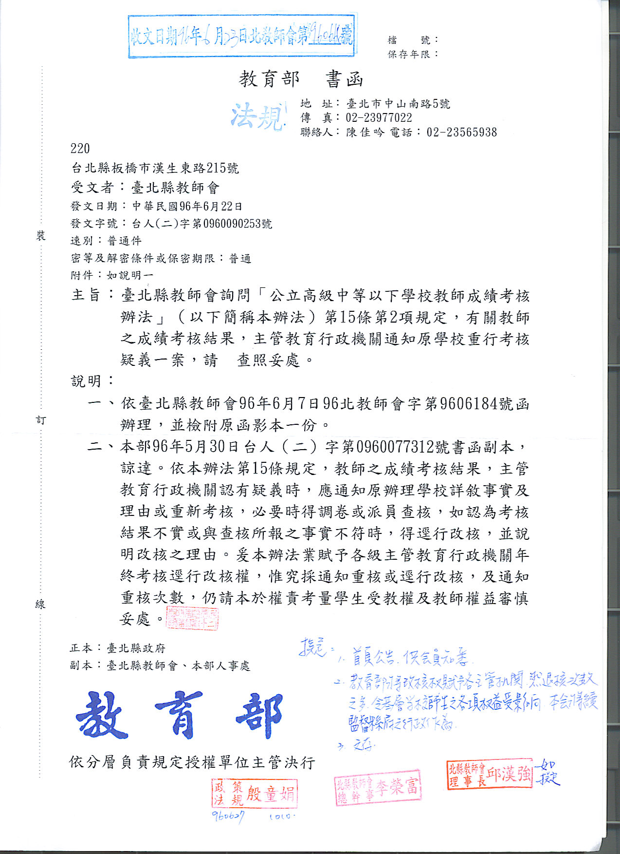 [重要公文]教育部書函-教師之成績考核結果主管教育機關得逕核疑義