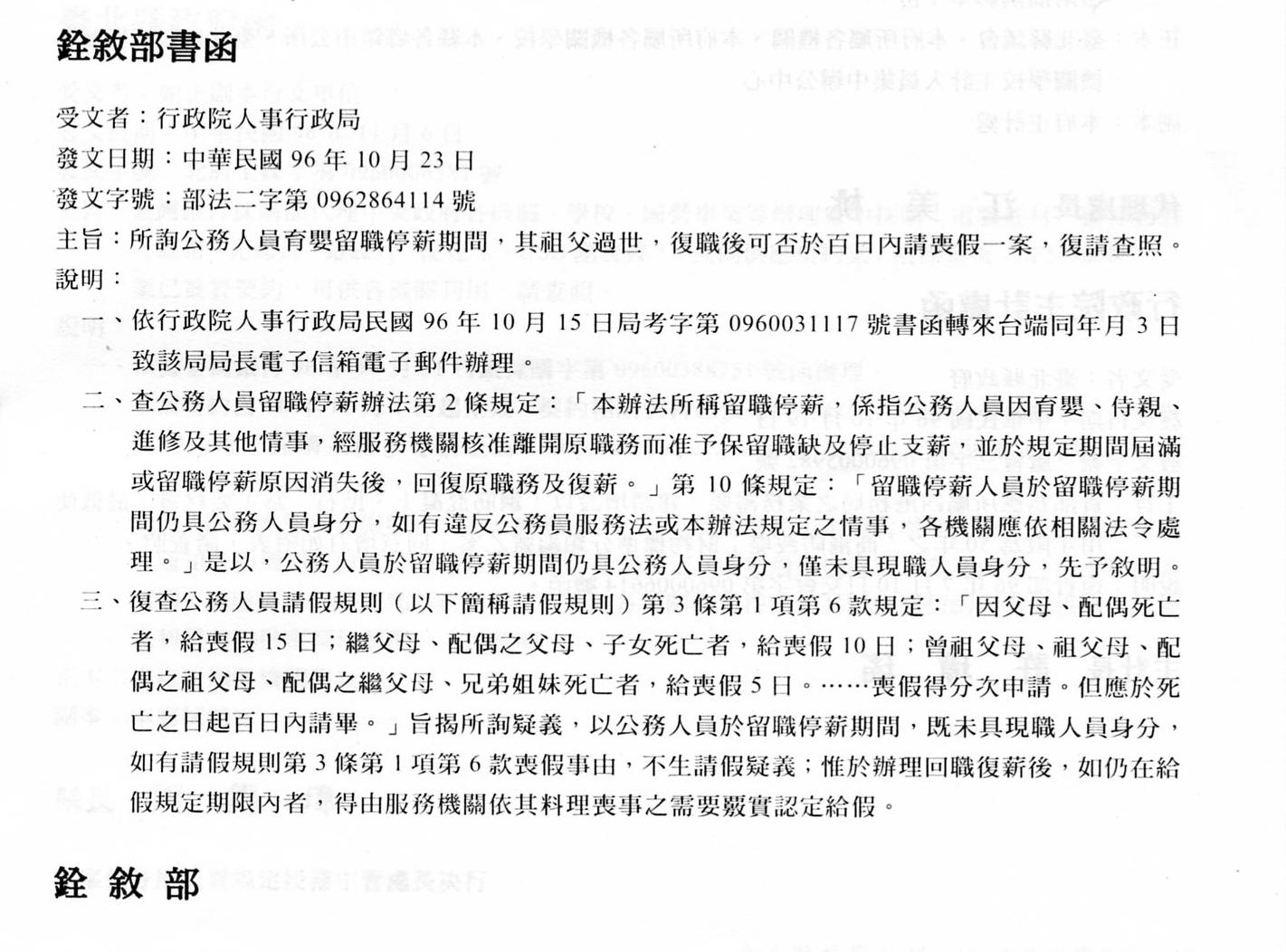 銓敘部函釋:育嬰留職停薪復職後請喪假疑義