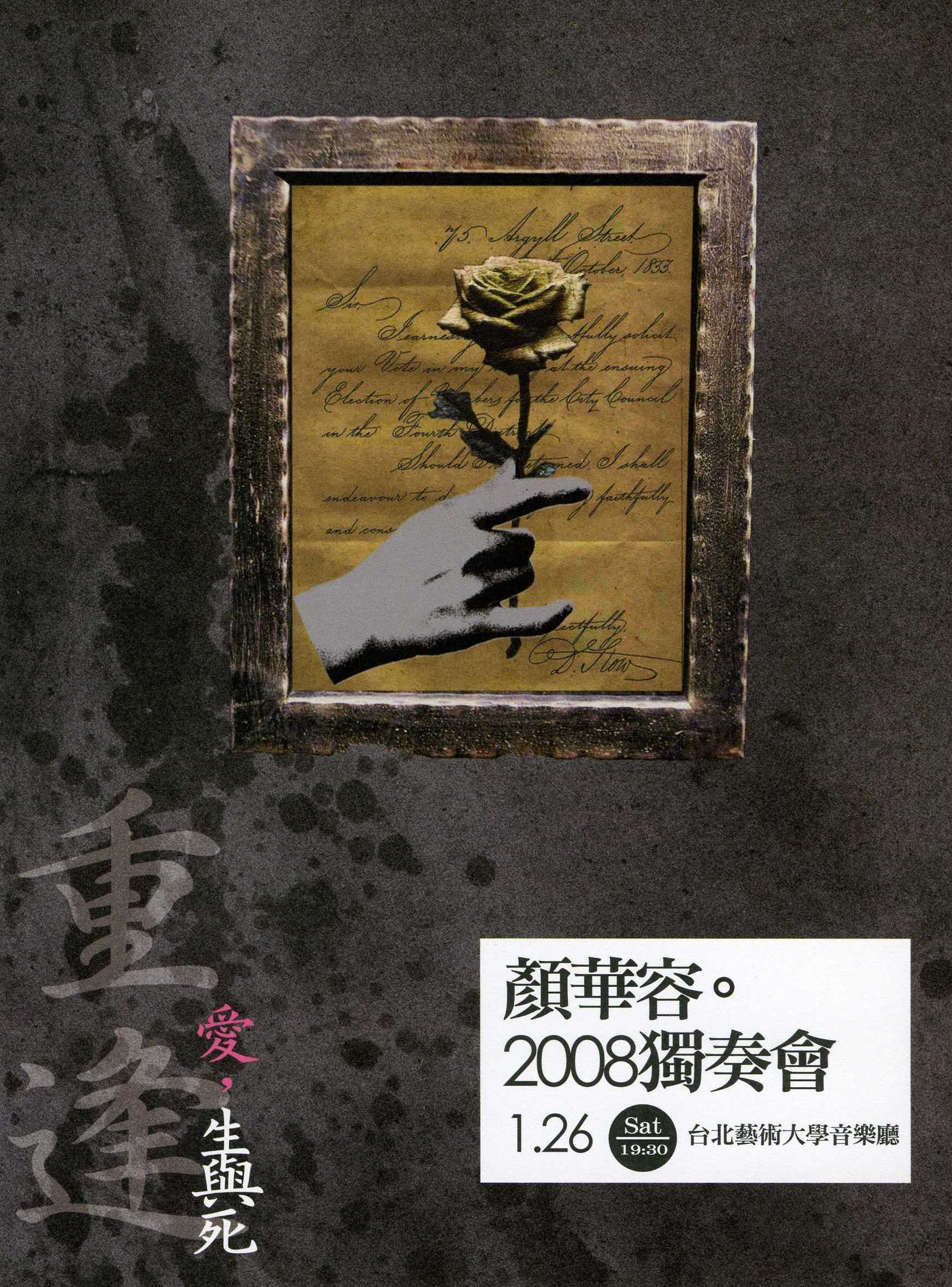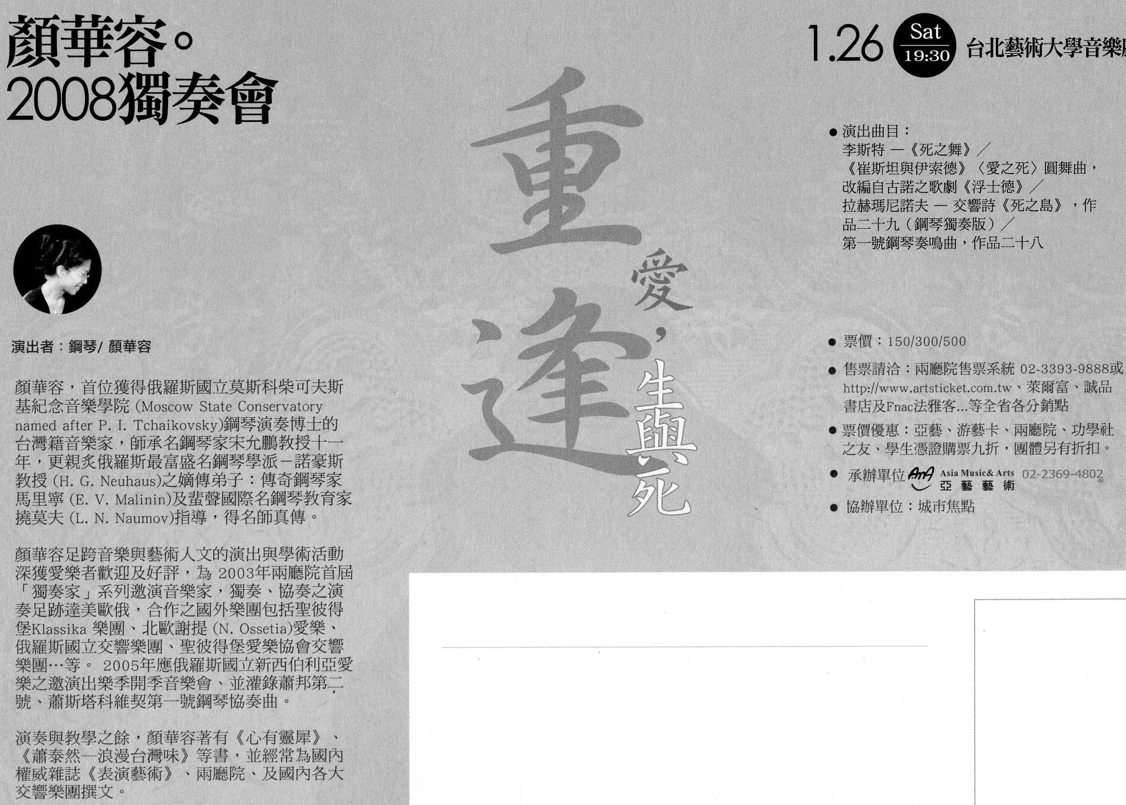 新年伊始萬象更新,很快又邁入嶄新的2008年代,顏華容特別選擇在留俄前畢業的母校 — 台北藝術大學 音樂廳,與樂迷在李斯特與拉赫瑪尼諾夫的鋼琴交響樂曲、繁麗雄偉的聲響中,靜觀愛、生與死,彈奏國內鮮見的曲目。在傳說中的俄羅斯學派詮釋下,盡展十九世紀文學、音樂相互輝眏的時代風華。