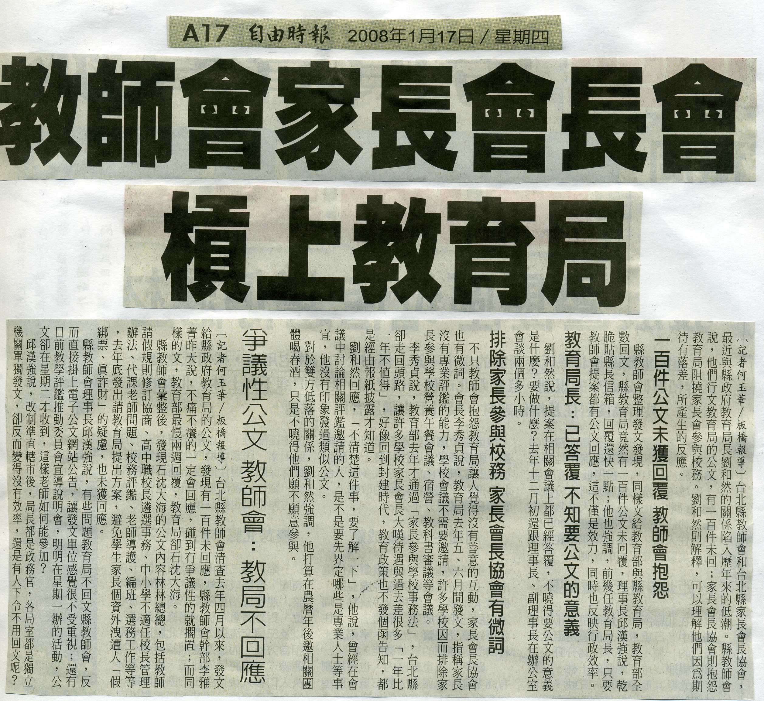 ﹝自由時報﹞今日報導:教師會家長會長會 槓上教育局