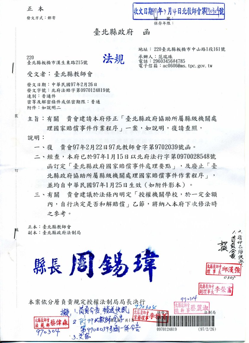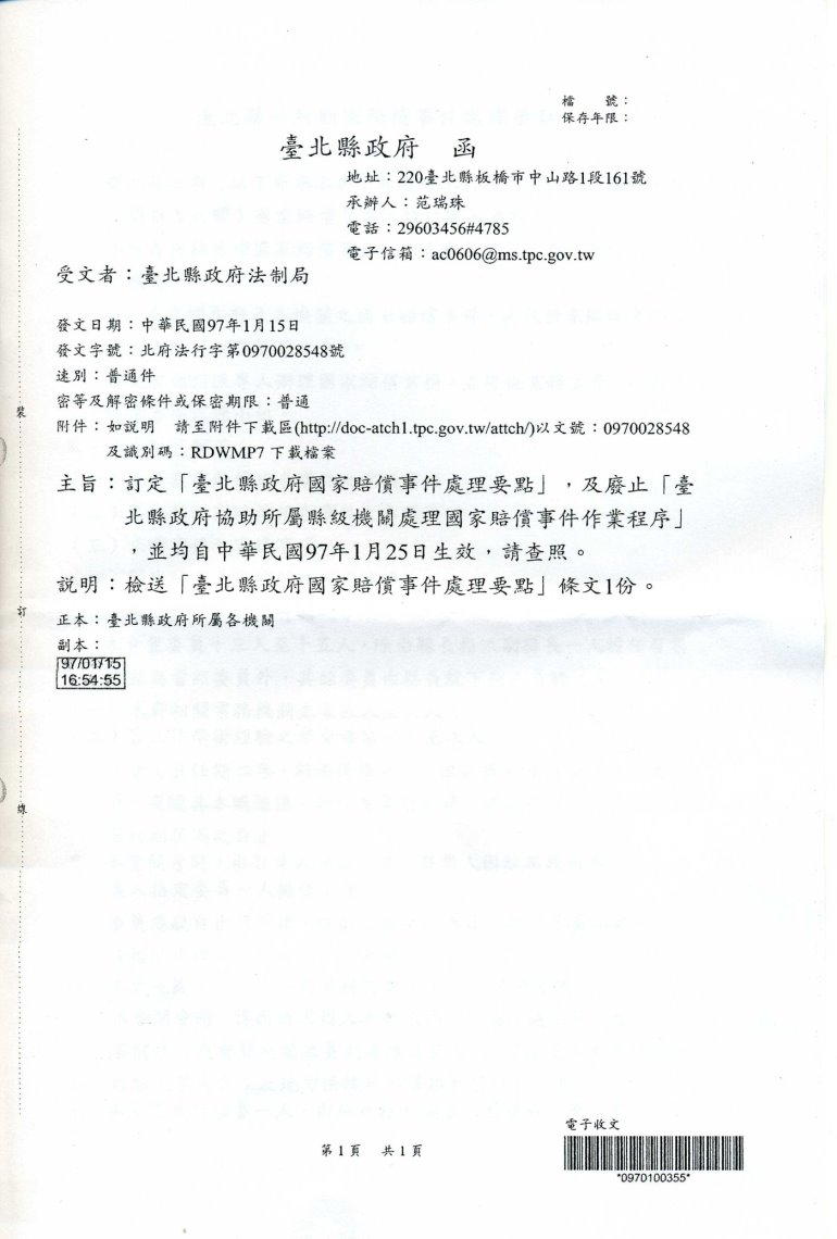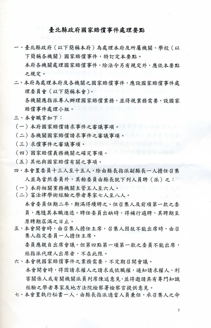 縣府回函本會建請修正「臺北縣政府協助所屬縣級機關處理國家賠償事件作業程序」ㄧ案