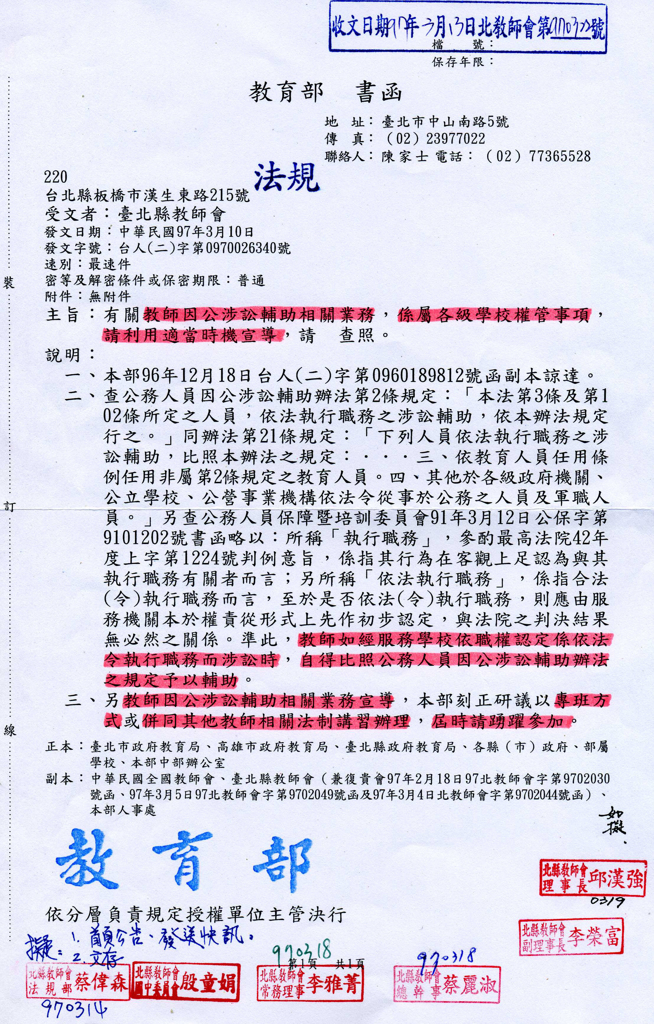 教育部函:有關教師因公涉訟輔助相關業務,係屬各級學校權管事項,請利用適當時機宣導。
